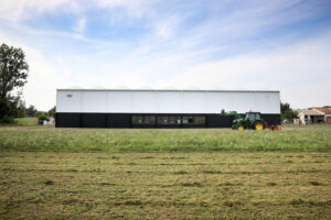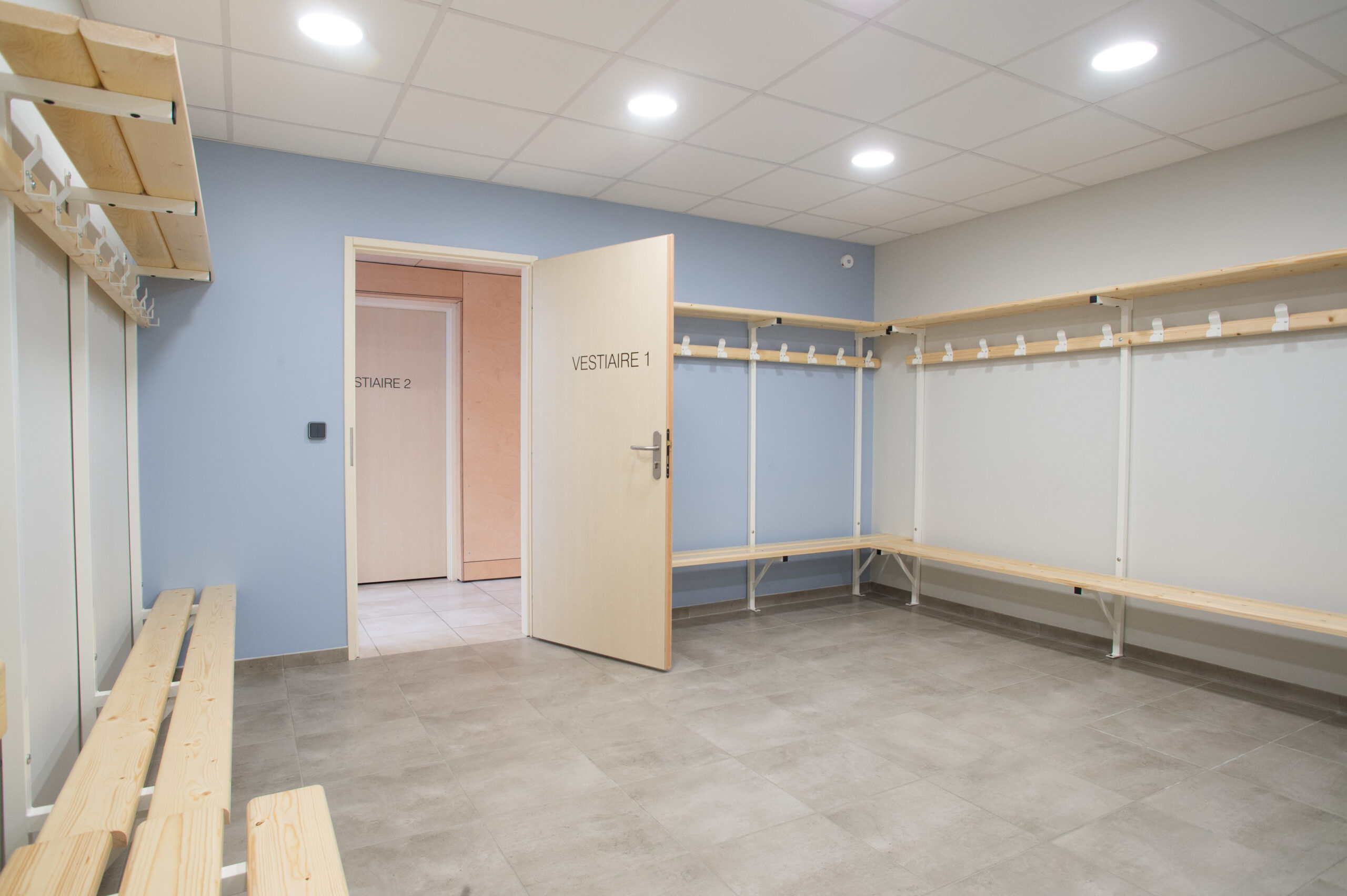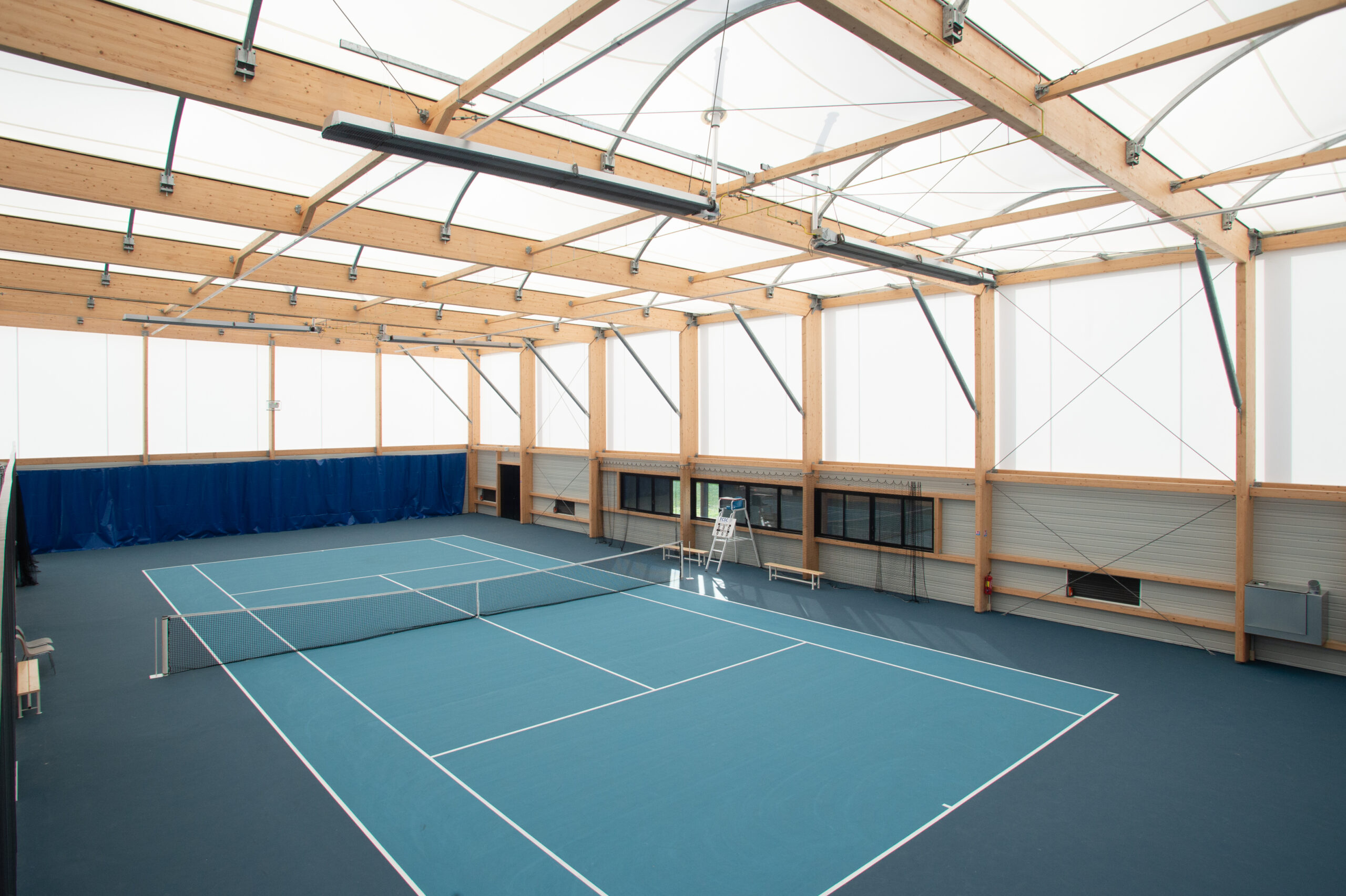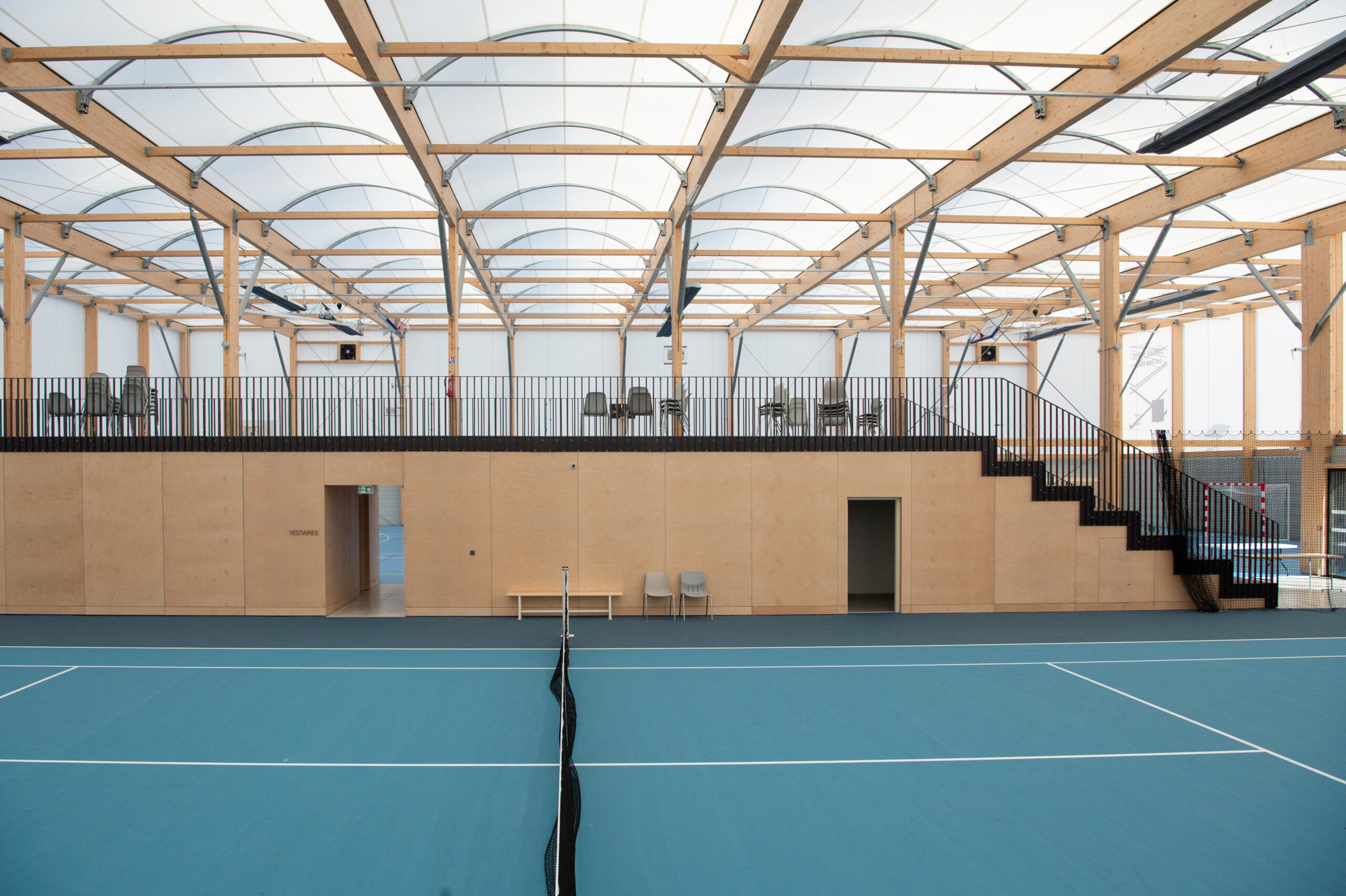 La halle sportive propose un espace multisports et un espace tennis. La zone vestiaire est intégrée sous la halle, cela permet de limiter les coûts et également de mettre en scène un espace de convivialité et un espace spectateur.