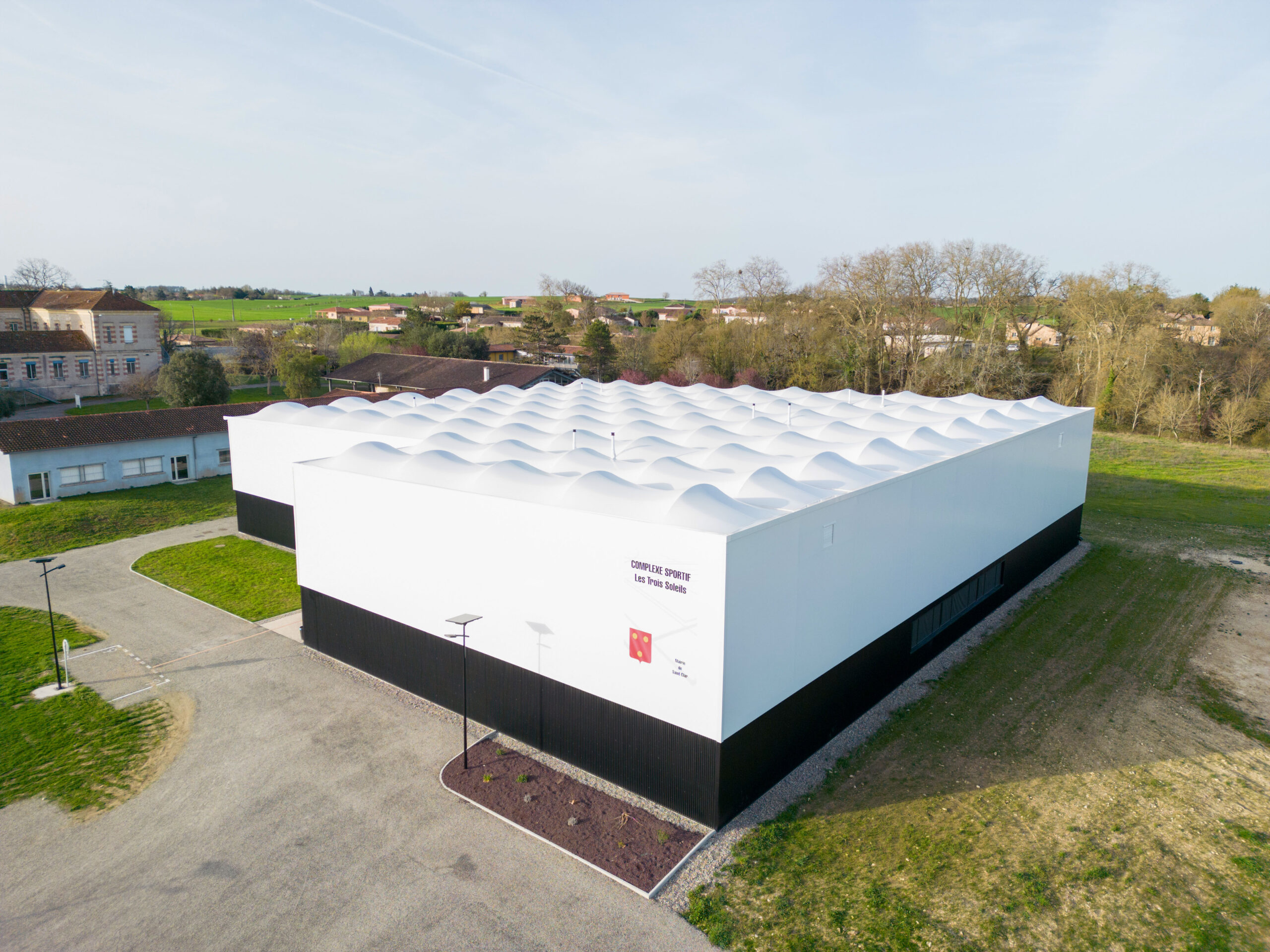 Le système constructif est en filière sèche à 95% (fondations, charpente bois, couverture, façades, sol sportif, bloc vestiaire en modulaire bois)